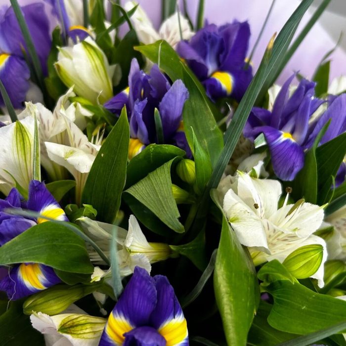 Букет из ярких фиолетовых ирисов и стойкой альстромерии