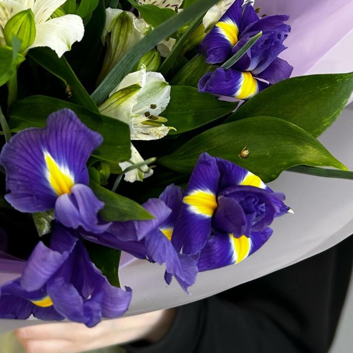 Ирис – 13 шт.Альстромерия – 8 шт.Зелень – 3 шт.Упаковка дизайнерская – 2 шт.Лента атласная – 2 шт.