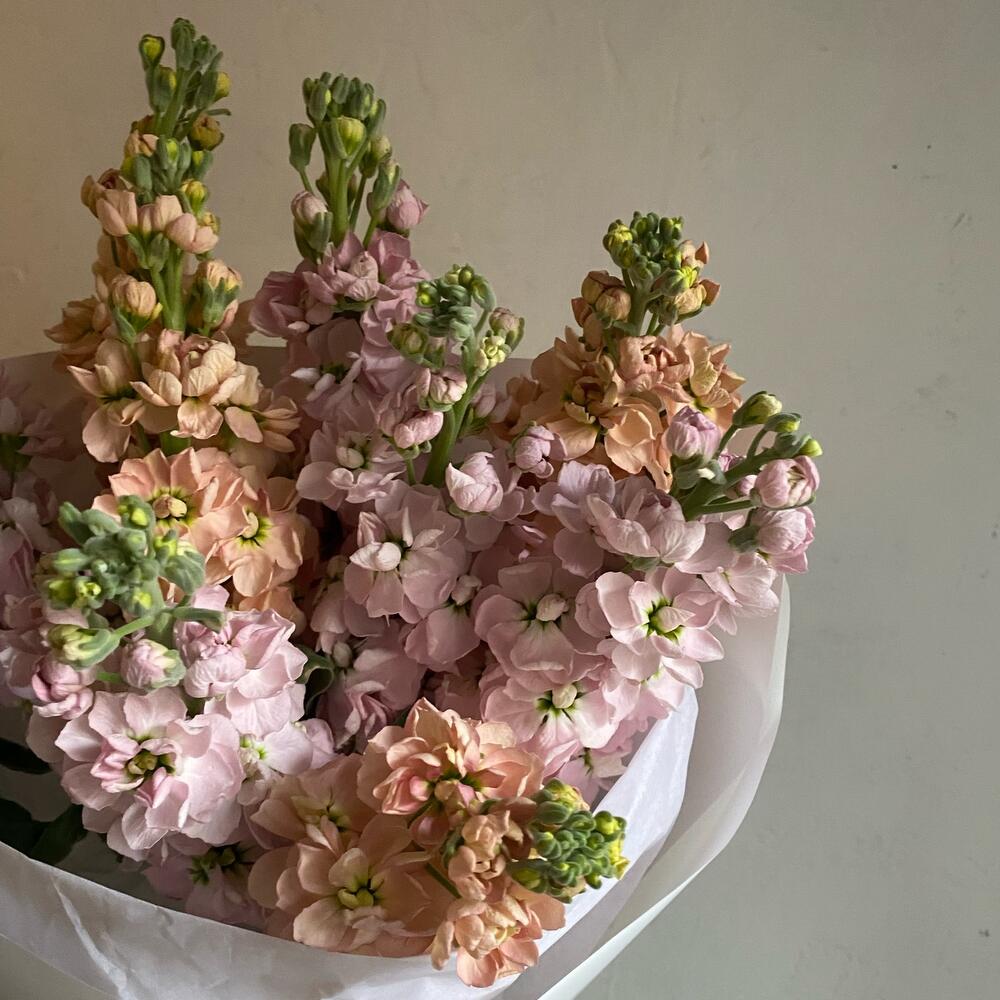 Маттиола – 9 шт.Тишью белое – 2 шт.Упаковка дизайнерская – 2 шт.Лента атласная – 2 шт.открытка с вашими пожеланиями – 1 шт.подкормка для срезанных цветов – 1 шт.