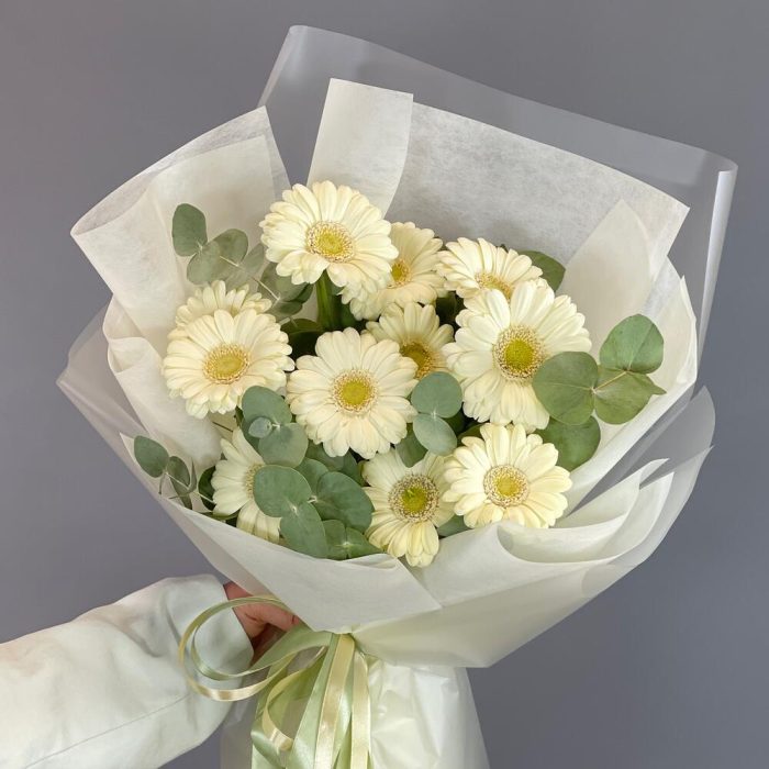 Лента – 1 шт.Эвкалипт – 2 шт.Упаковка – 1 шт.Гербера мини – 11 шт.