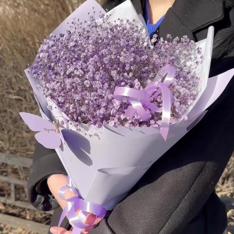 Лента атласная – 1 шт.Тишью – 1 шт.Пленка матовая – 1 шт.Открыточка с вашими пожеланиями – 1 шт.Гипсофила фиолетовая – 7 шт.