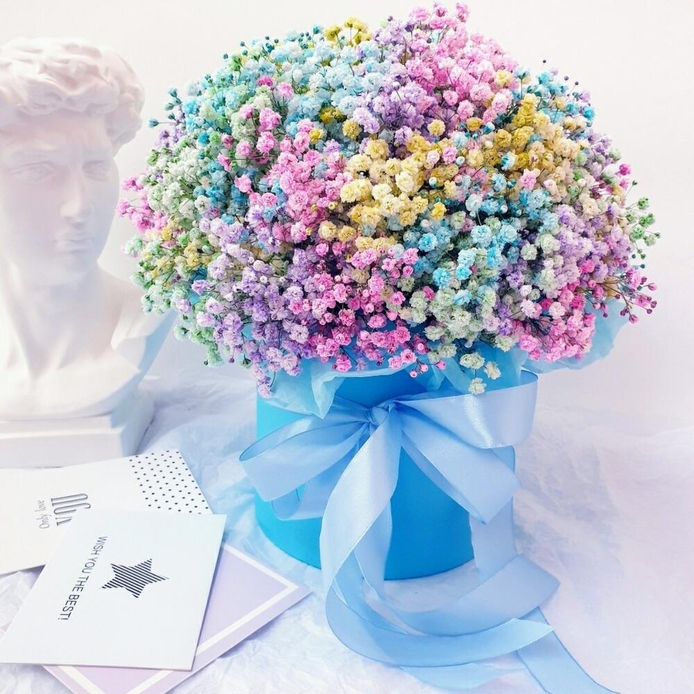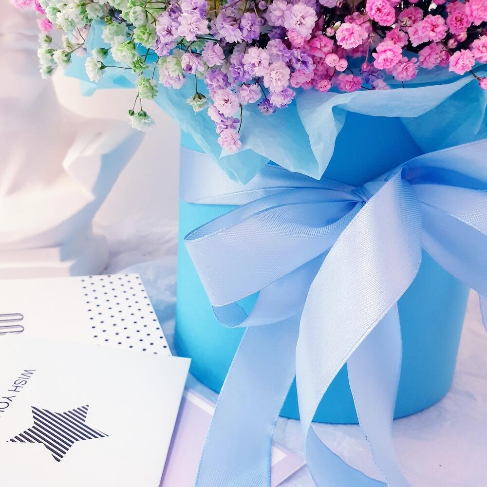 Лента атласная – 1 шт.Открыточка с вашими пожеланиями – 1 шт.Оазис флористический – 1 шт.гипсофила радужная – 9 шт.тишью голубое – 1 шт.коробка шляпная голубая – 1 шт.любовь флориста (бесплатно) – 1 шт.