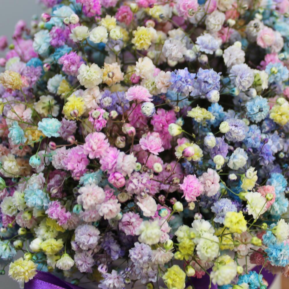гипсофила радужная эквадор – 45 шт.Шляпная коробка – 1 шт.Оазис флористический – 1 шт.Лента атласная – 1 шт.любовь флориста (бесплатно) – 1 шт.инструкция по уходу за цветами – 1 шт.