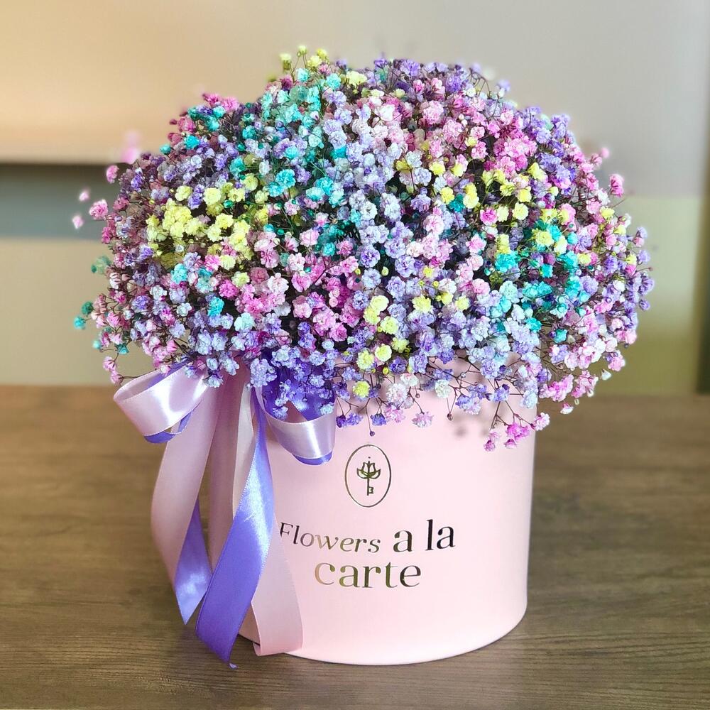 Лента атласная – 2 шт.Коробка шляпная – 1 шт.Оазис флористический – 1 шт.гипсофила радужная – 8 шт.