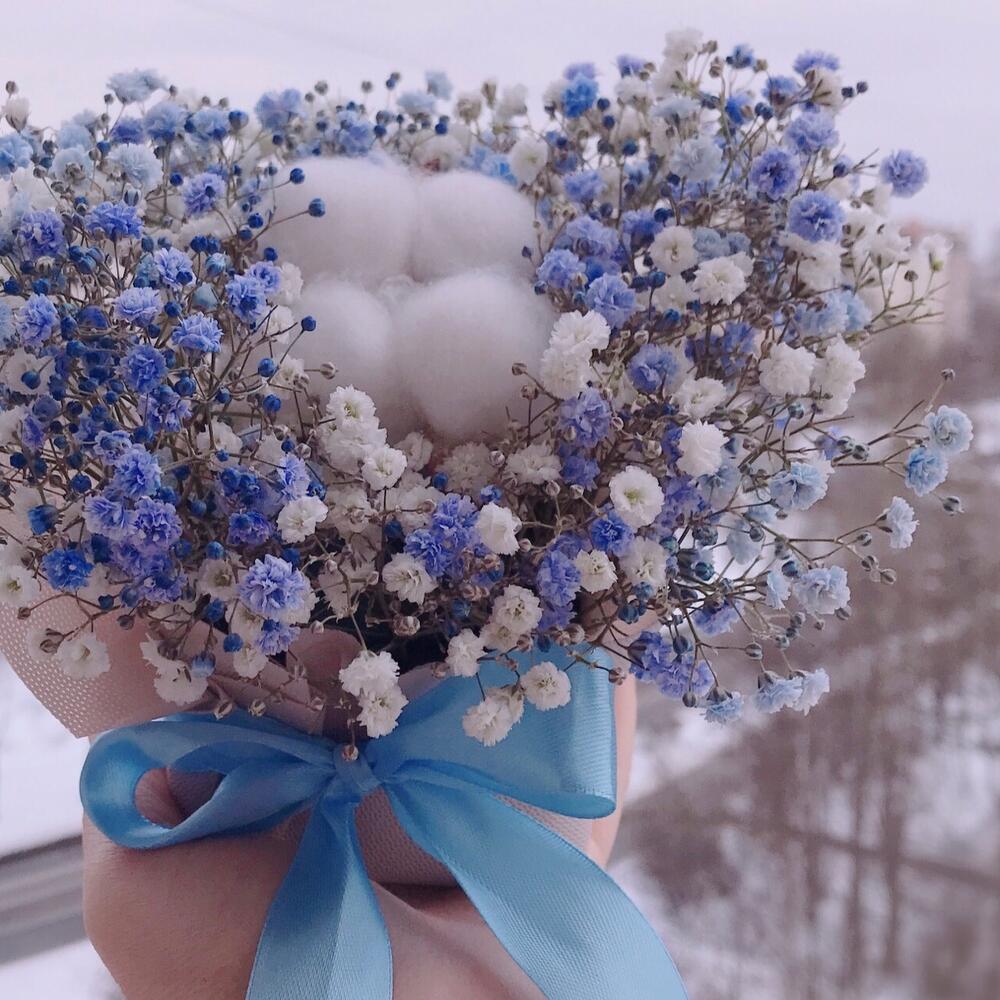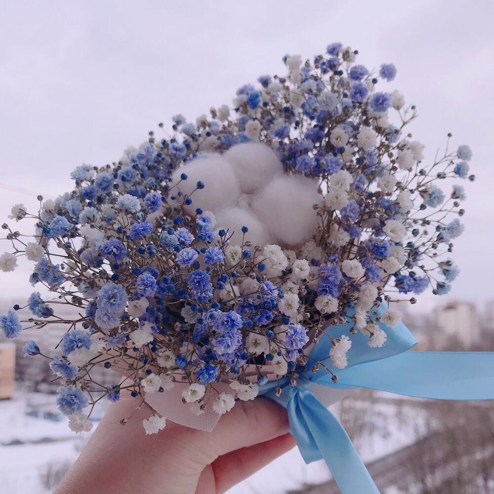 Хлопок – 1 шт.Флористическая губка – 1 шт.Гипсофила голубая – 1 шт.гипсофила белая – 1 шт.