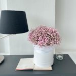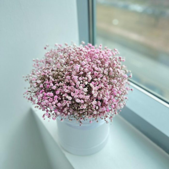 Композиция из 7 стеблей розовой гипсофилы в светлой шляпной коробке