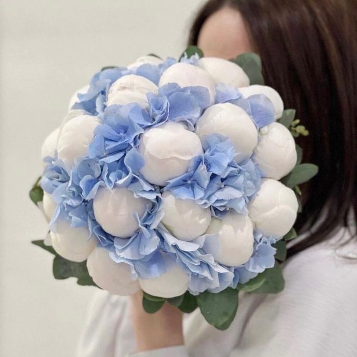 Пион белый – 15 шт.Гортензия голубая – 3 шт.Упаковка дизайнерская – 1 шт.Лента атласная – 2 шт.Открыточка с вашими пожеланиями – 1 шт.хорошее настроение – 100 шт.инструкция по уходу за цветами – 1 шт.коробка переноска – 1 шт.Кризал – 1 шт.