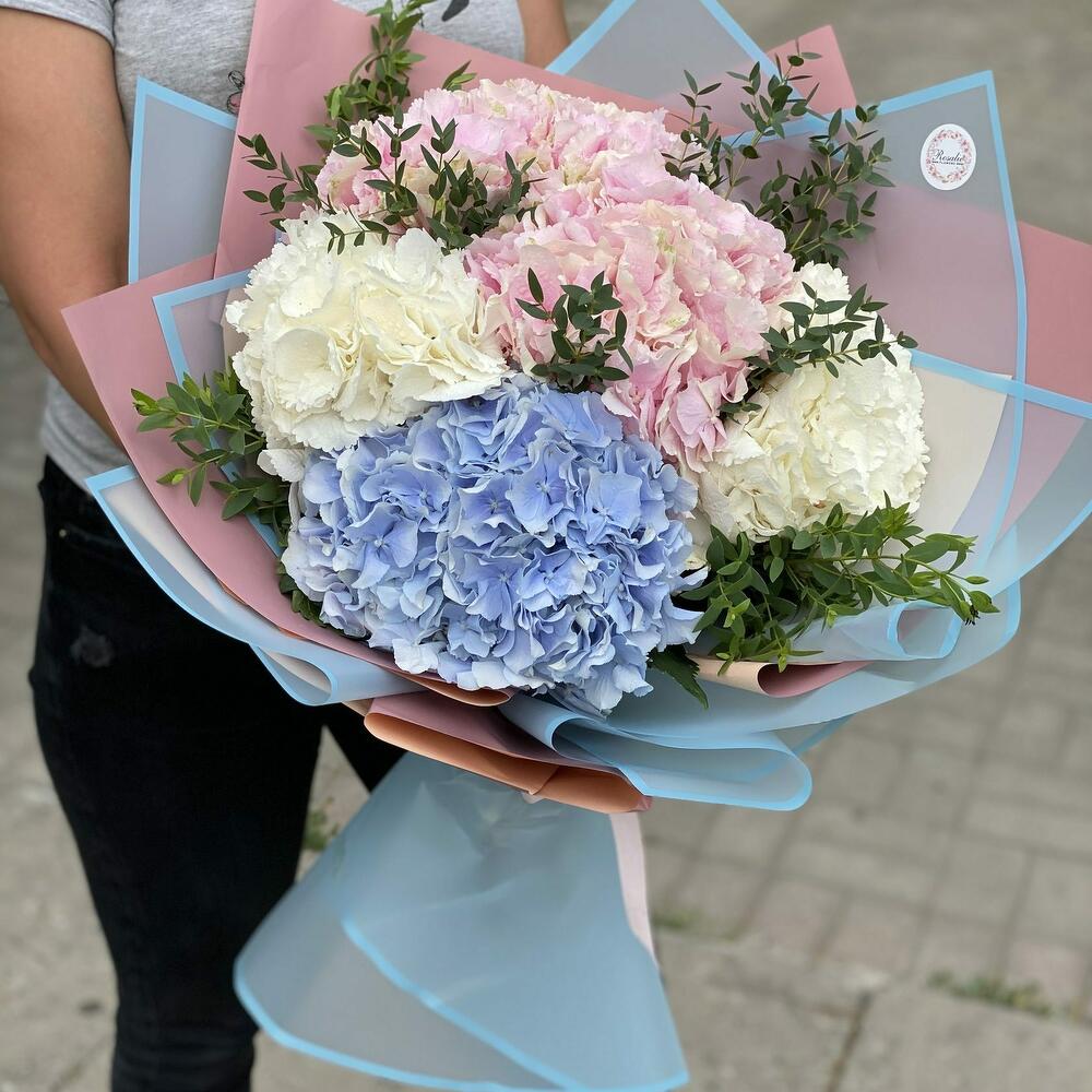 Альстромерии, Гортензии, Кустовые розы, Пионовидные розы, Розы