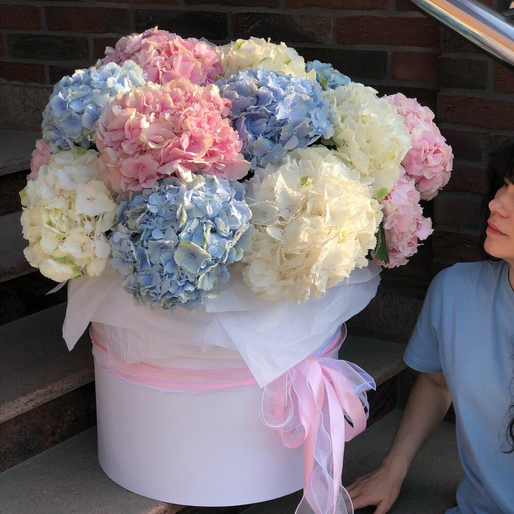 Тишью – 4 шт.Коробка шляпная – 1 шт.Флористическая губка (оазис) – 5 шт.лента премиум – 4 шт.гортензия голландия микс – 21 шт.