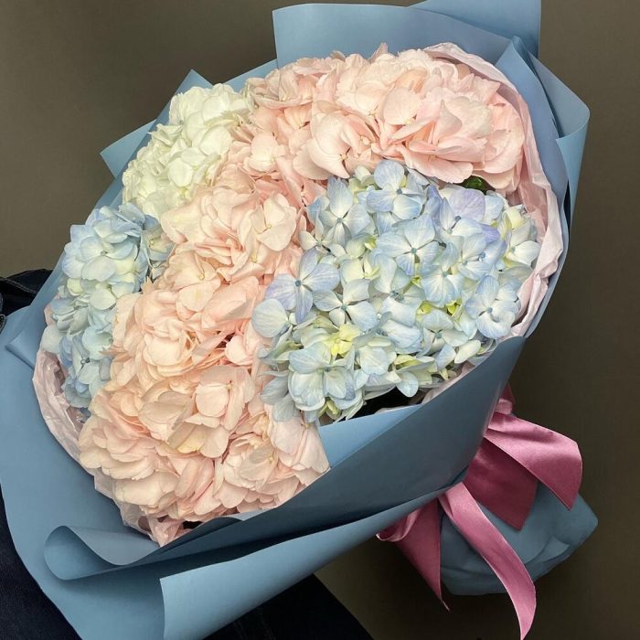 Лента атласная – 1 шт.Тишью – 1 шт.Гортензия белая – 1 шт.Гортензия голубая – 2 шт.Калька – 1 шт.Гортензия розовая – 2 шт.