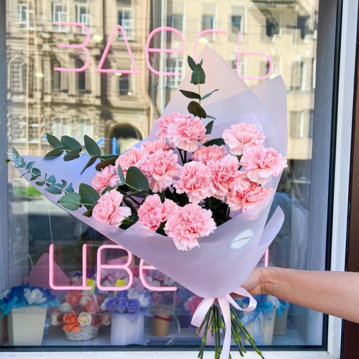 Диантус сортовой – 15 шт.Эвкалипт – 2 шт.Тишью – 1 шт.Корейская пленка – 2 шт.Лента атласная – 1 шт.Аквапак – 1 шт.