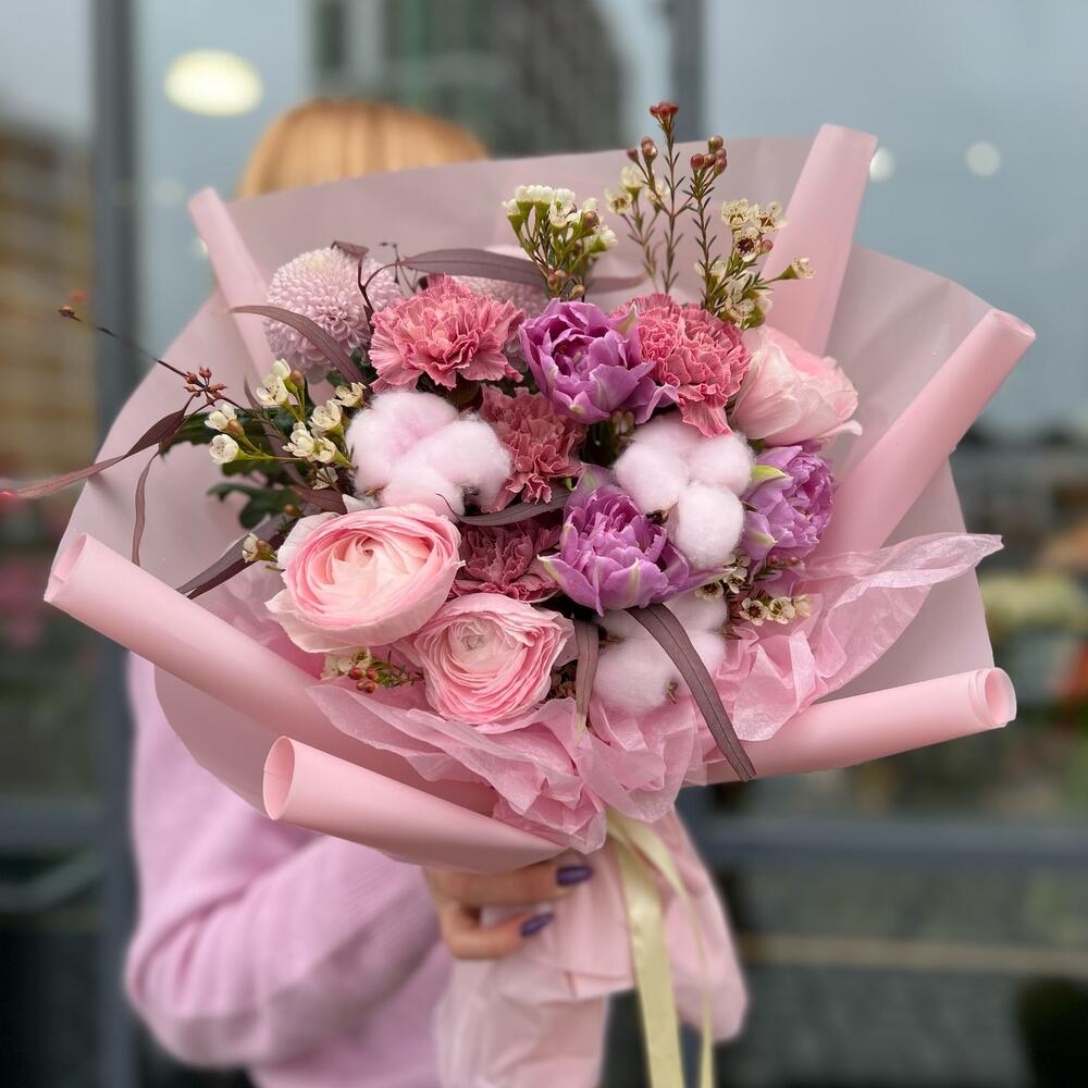 Букет из ранункулюсов, тюльпанов и диантусов «Лавандовая нежность»