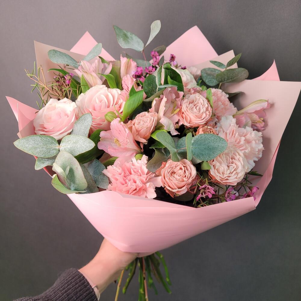 Букет роз, альстромерии и эвкалипта «Розовый закат»