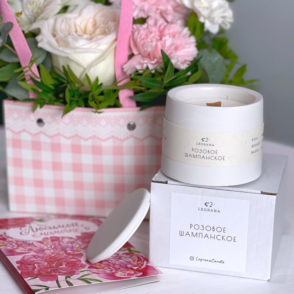 В этом чудесном подарочном наборе мы собрали все самое лучшее для Вашей мамы:- цветочная композиция в нежной гамме, в составе которой ароматная пионовидная роза, гвоздики, альстромерии- открытка с шоколадками, каждая из которых несет в себе трогательные слова для мамы- … Показать ещёАроматическая свеча с неповторимым нишевым ароматом «Розовое шампанское»