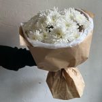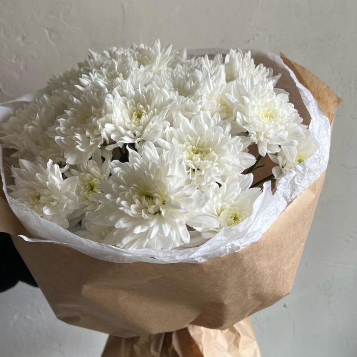 Лента атласная – 2 шт.Хризантема кустовая белая – 7 шт.Упаковка дизайнерская – 3 шт.