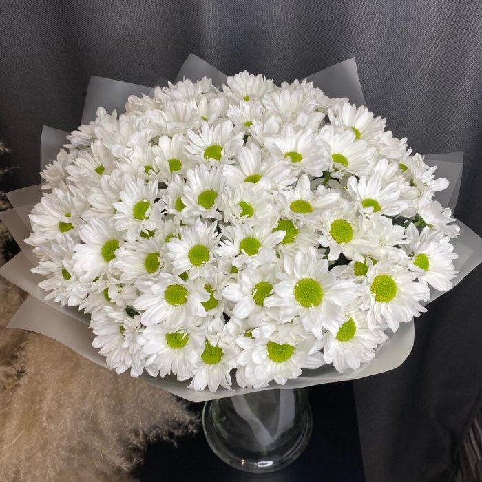 Хризантема кустовая – 15 шт.Дизайнерская упаковка – 1 шт.Лента атласная – 1 шт.