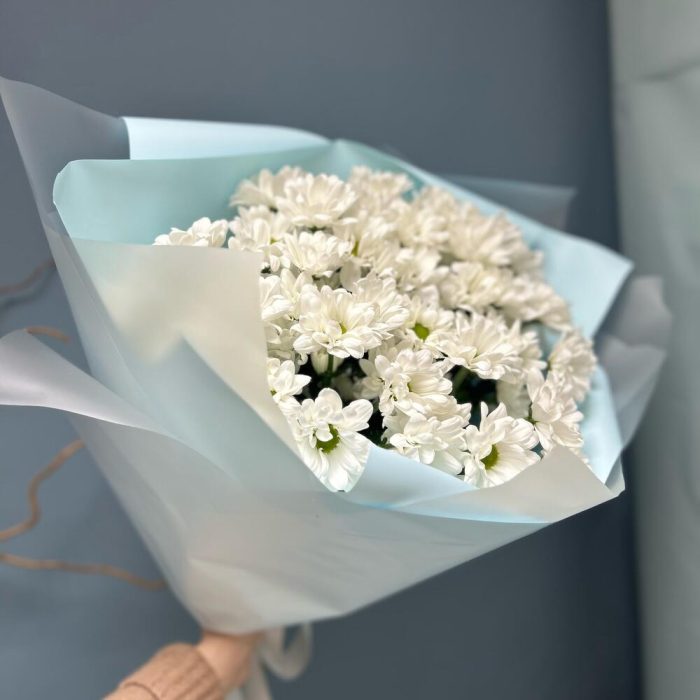 Кустовая хризантема – 9 шт.Упаковка – 2 шт.Лента атласная – 1 шт.