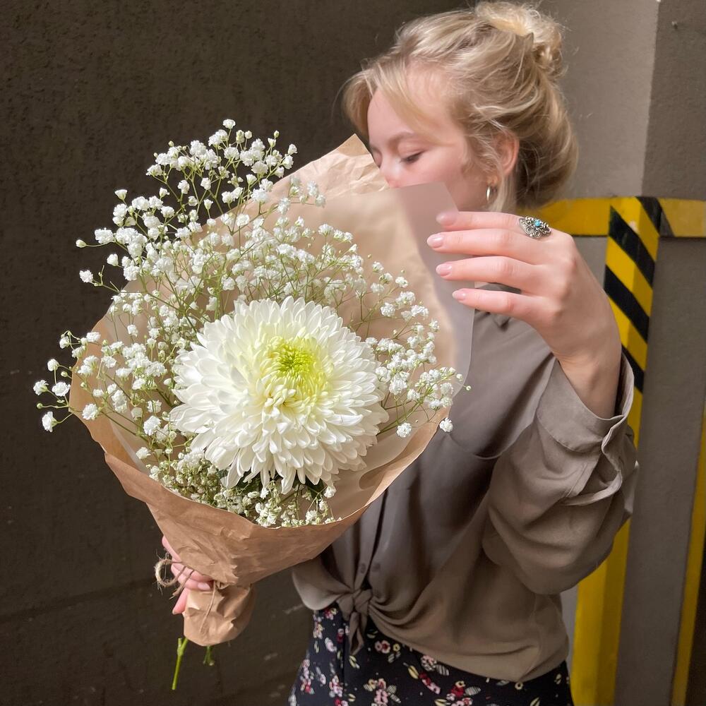 Гипсофила – 2 шт.Хризантема одноголовая – 1 шт.Упаковка дизайнерская – 3 шт.