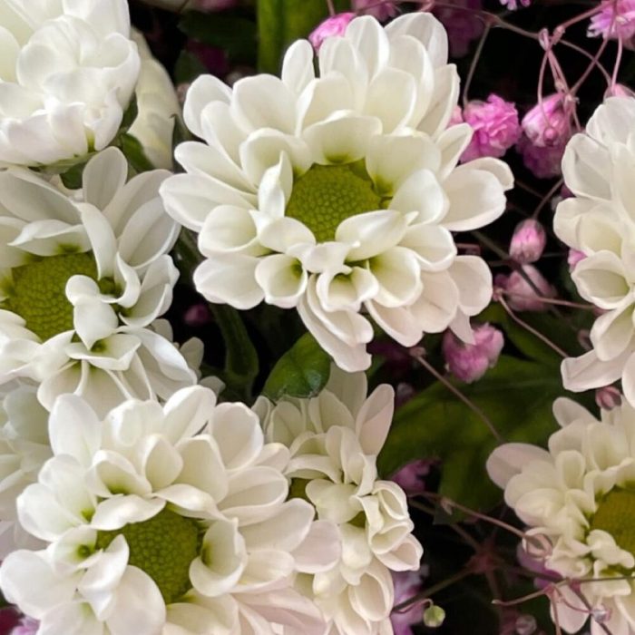 Гипсофила – 2 шт.Хризантема Сантини – 9 шт.Лента атласная – 1 шт.Тишью – 2 шт.Упаковка дизайнерская – 1 шт.