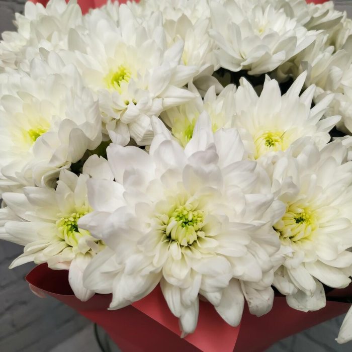 Прекрасный букет из белых хризантем, станет идеальным подарком для самых любимых и близких!Памятка для букета:1. Чистая вода раз в сутки.2. Стебли подрезаем на 0,5см при каждой смене воды.3. Ставим в прохладное место, но не у окна.4. Чтобы вода оставалась свежей, не допускайте попадания листьев и лепестков в воду.Друзья, обратите внимание, что цвет упаковки может быть другим, в зависимости от наличия на складе.