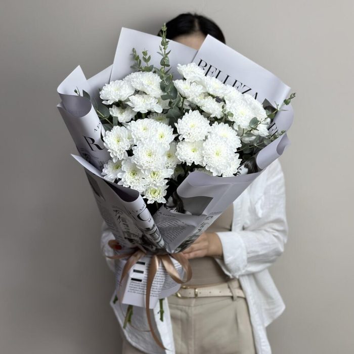 Хризантема и гипсофила в шляпной коробке, цвет белый