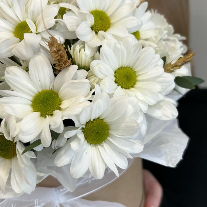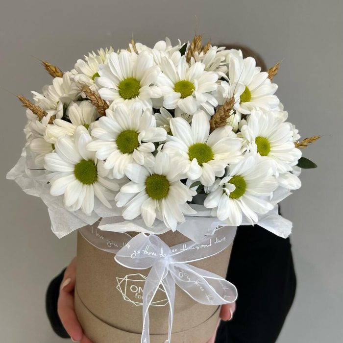 Композиция в коробке из белой кустовой хризантемы и веточек пшеницы