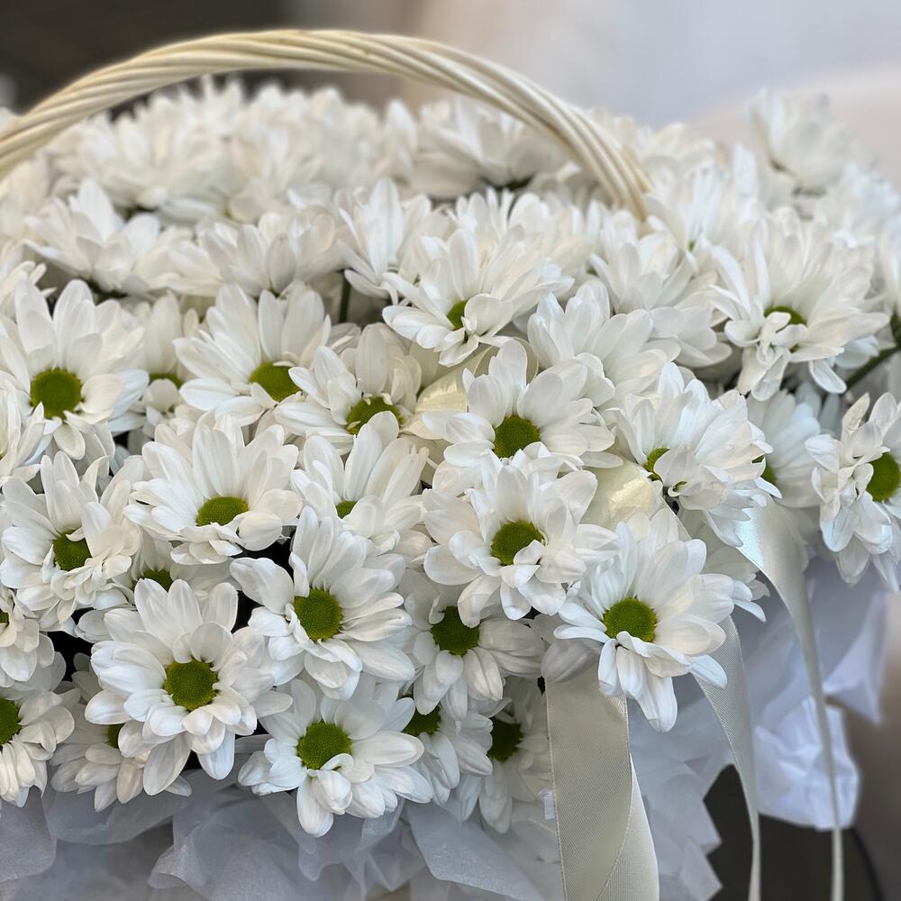 Хризантема кустовая – 17 шт.Лента атласная – 1 шт.Корзина плетеная – 1 шт.Оазис флористический – 2 шт.