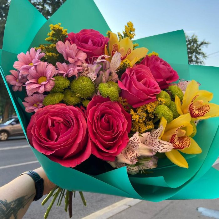 Pink floyd – 5 шт.Орхидея Цимбидиум – 3 шт.Альстромерия – 3 шт.Хризантема кустовая – 4 шт.Солидаго – 3 шт.Рускус – 5 шт.Упаковка дизайнерская – 3 шт.Лента атласная – 2 шт.