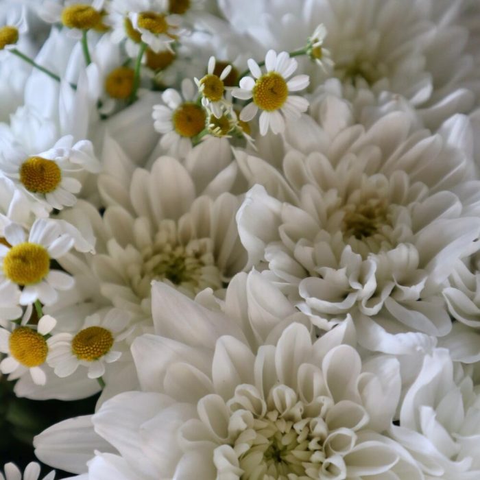 Хризантема кустовая – 3 шт.Пленка матовая – 4 шт.Матрикария (Ромашка Камила) – 5 шт.Лента репсовая – 1 шт.Калька упаковка – 4 шт.