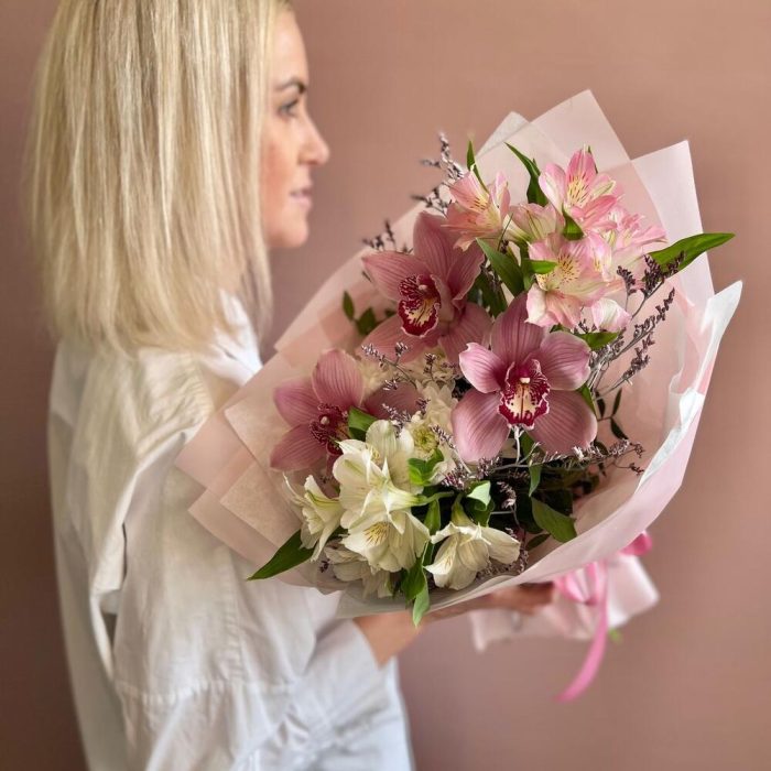 Нежный романтичный букет в розовой гамме. В составе орхидея цимбидиум, альстромерия, кустовая хризантема и лимониум. Идеальный букет на 8 мартаРекомендации по уходу: ежедневная смена воды с обновлением среза секатором или острым ножом. Цветы нужно ставить в прохладном месте, подальше от прямых солнечных лучей и отопительных приборов. Для того, чтобы букет дольше радовал получателя, мы отправляем с каждым заказом инструкцию по уходу и специальное средство для продления жизни цветов