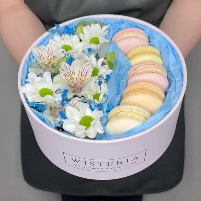 Альстромерия – 1 шт.Эвкалипт – 1 шт.Тишью – 1 шт.Хризантема кустовая ромашковая – 1 шт.Губка флористическая – 1 шт.гипсофила цветная – 1 шт.макарон ассорти – 5 шт.