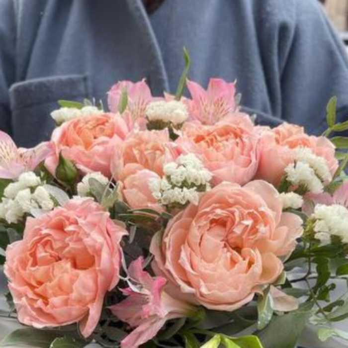 Корзина с персиковыми розами и альстромерией "Клодетт Колбер"