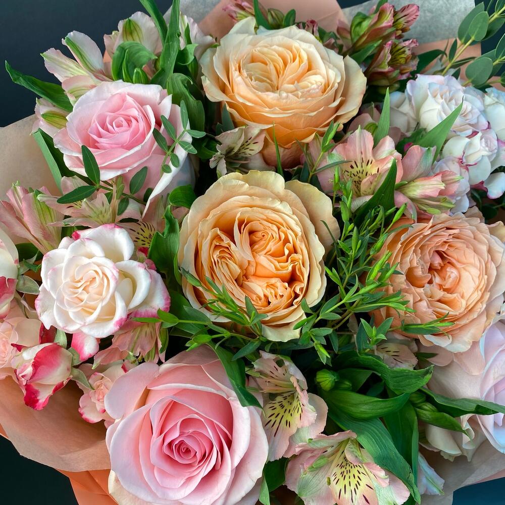 Роза Эквадор – 7 шт.Роза кустовая – 2 шт.Альстромерия Микс Европа – 5 шт.зелень декоративная – 5 шт.Упаковка дизайнерская – 5 шт.Лента атласная – 1 шт.