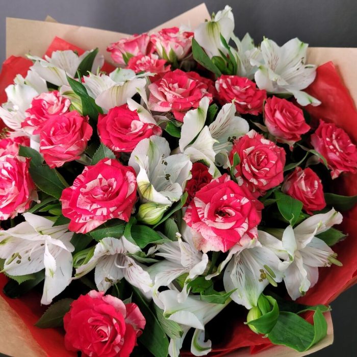 Роза кустовая – 3 шт.Альстромерия – 5 шт.Тишью – 2 шт.Крафт – 2 шт.