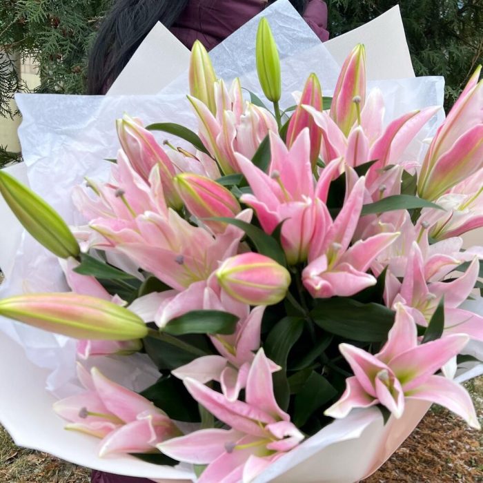 Тишью – 3 шт.лилия ориентальная розовая – 7 шт.структурированный фаомиран – 3 шт.