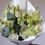Лента – 1 шт.Эвкалипт – 3 шт.Упаковка – 2 шт.Лизиантус белый – 5 шт.