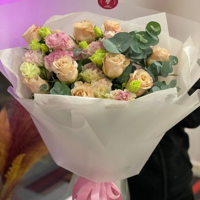Альстромерии, Гвоздики, Кустовые розы, Лизиантусы, Розы, Хризантемы