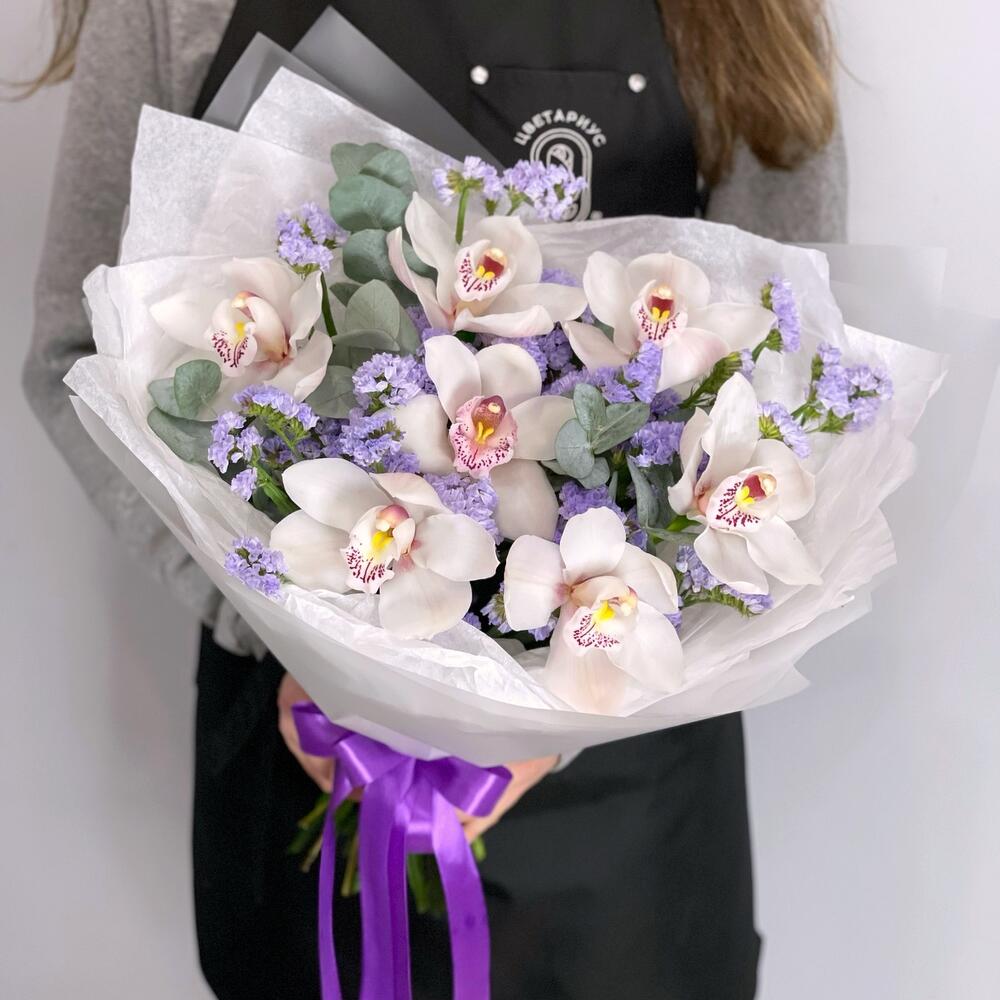 белая орхидея сорт цимбидиум – 7 шт.Статица – 7 шт.Эвкалипт – 2 шт.Упаковка дизайнерская – 1 шт.