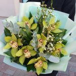 Орхидея Цимбидиум – 7 шт.Эвкалипт – 1 шт.Зелень – 10 шт.Ваксфлауэр – 1 шт.Упаковка дизайнерская – 1 шт.Лента атласная – 1 шт.