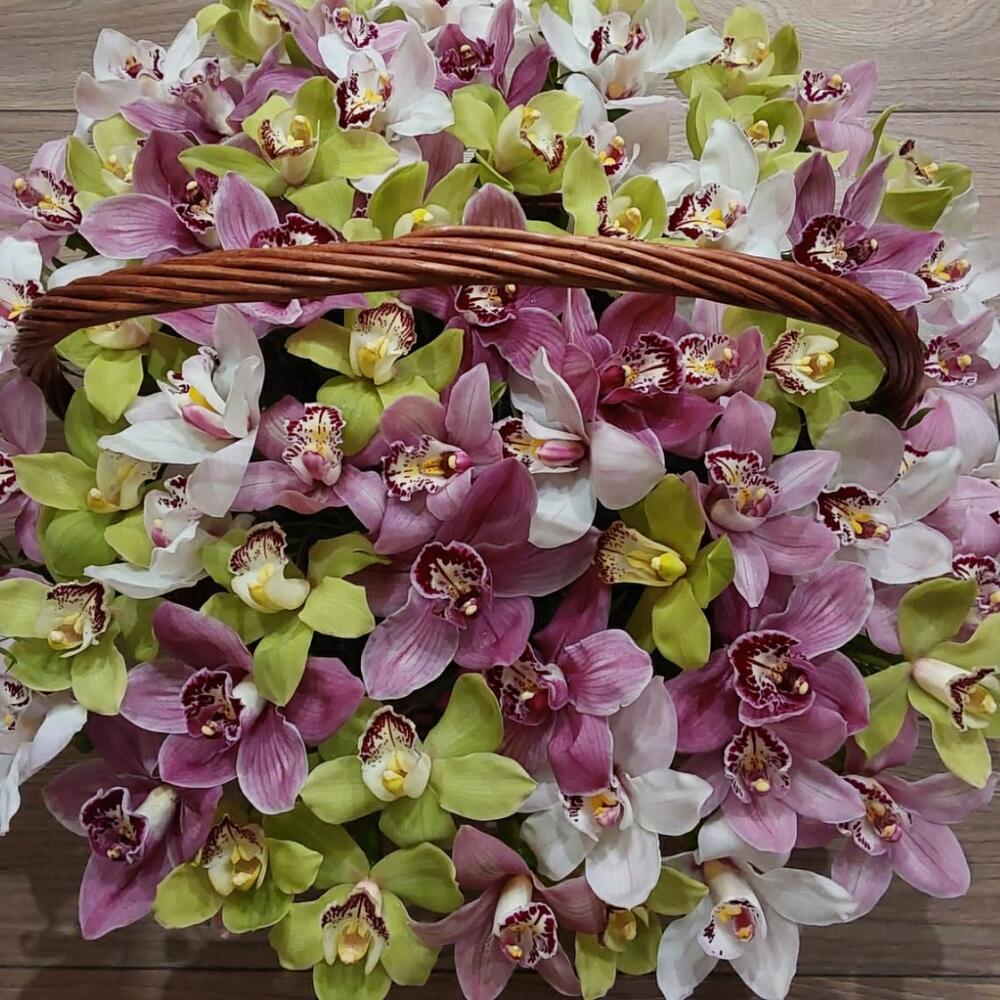 Орхидея Цимбидиум – 5 шт.Зелень – 20 шт.Корзина – 1 шт.Оазис – 3 шт.
