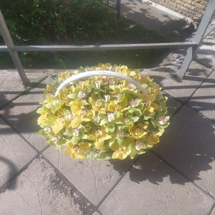 Орхидея Цимбидиум – 4 шт.Корзина плетеная – 1 шт.Оазис флористический – 3 шт.зелень декоративная – 20 шт.