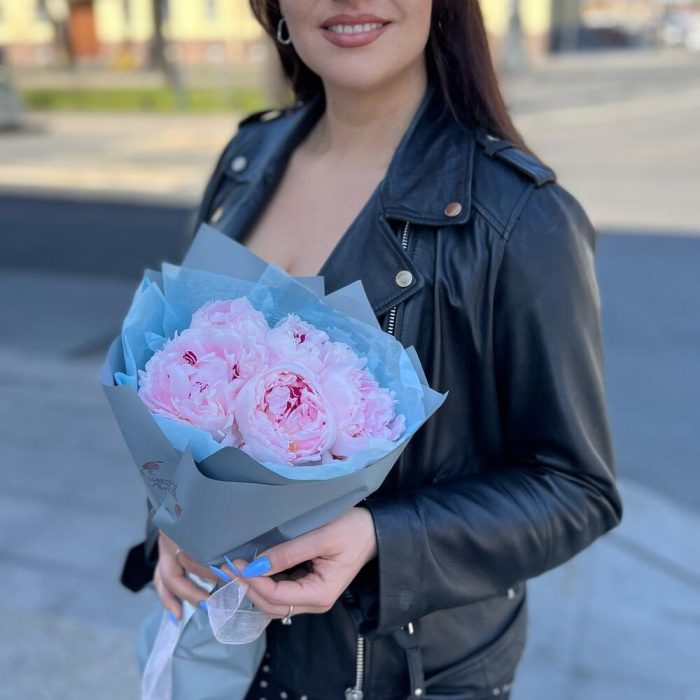 Пион Сара Бернар – 5 шт.Дизайнерская упаковка – 1 шт.Упаковка тишью – 1 шт.Атласная лента – 1 шт.крафт конверт – 1 шт.подкормка для срезанных цветов – 1 шт.инструкция по уходу за цветами – 1 шт.аквапак с водой – 1 шт.