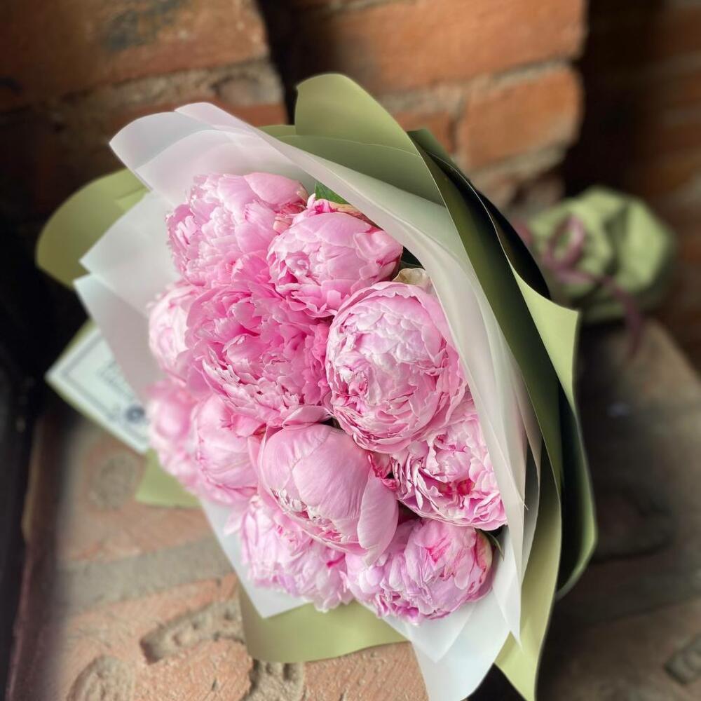 Букет из 11 пионов в дизайнерской упаковке “Джун Спринг”