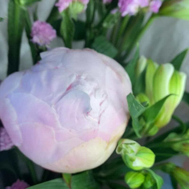 Упаковка – 1 шт.Альстромерия белая – 3 шт.Пион розовый – 3 шт.Статица розовая – 1 шт.