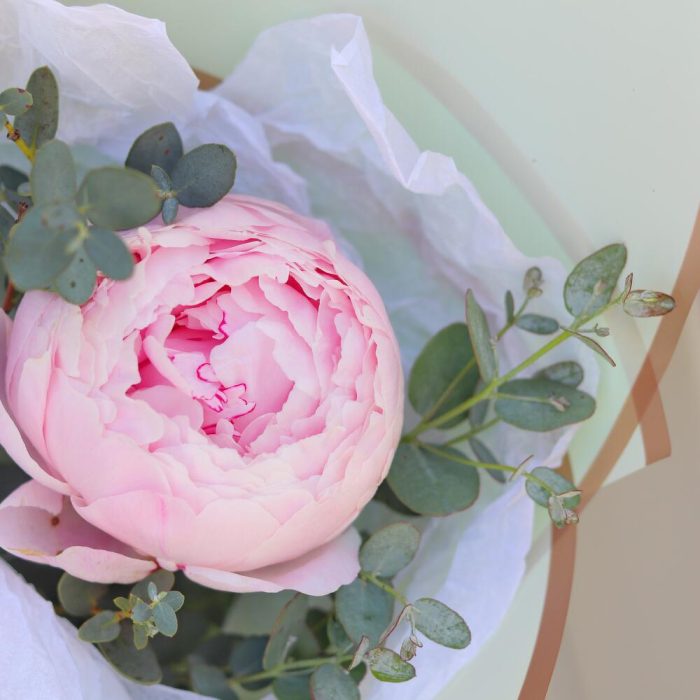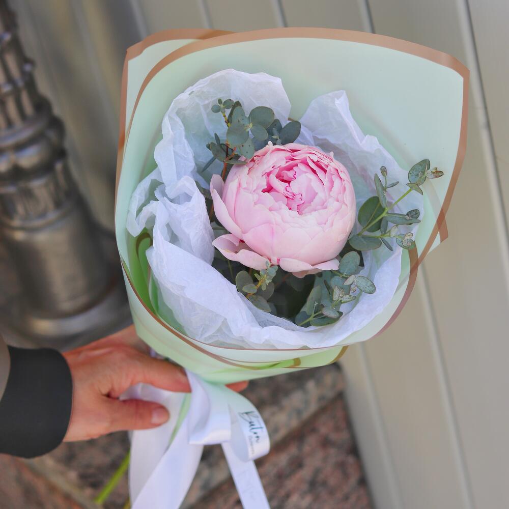 Эвкалипт – 1 шт.Пион Сара Бернар – 1 шт.Открыточка с вашими пожеланиями – 1 шт.Шоколадка – 1 шт.Дизайнерская упаковка – 1 шт.