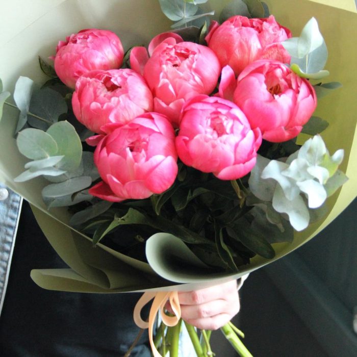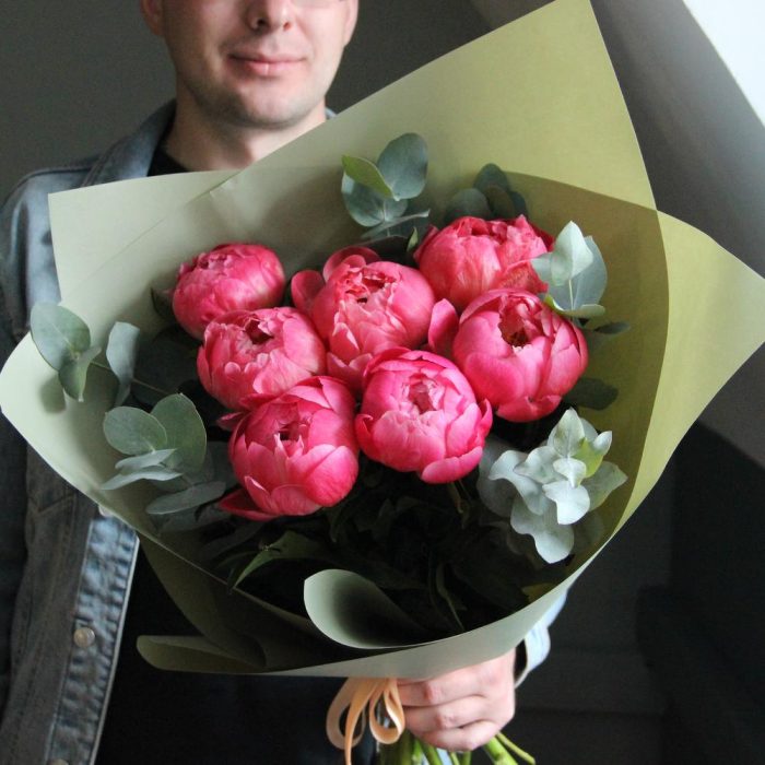 Пион – 7 шт.Эвкалипт – 5 шт.Упаковка – 2 шт.Лента атласная – 2 шт.