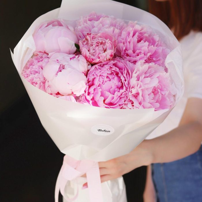 Пион розовый – 9 шт.Подкормка – 1 шт.Открыточка с вашими пожеланиями – 1 шт.Шоколадка – 1 шт.Дизайнерская упаковка – 1 шт.инструкция по уходу за цветами – 1 шт.