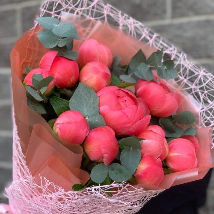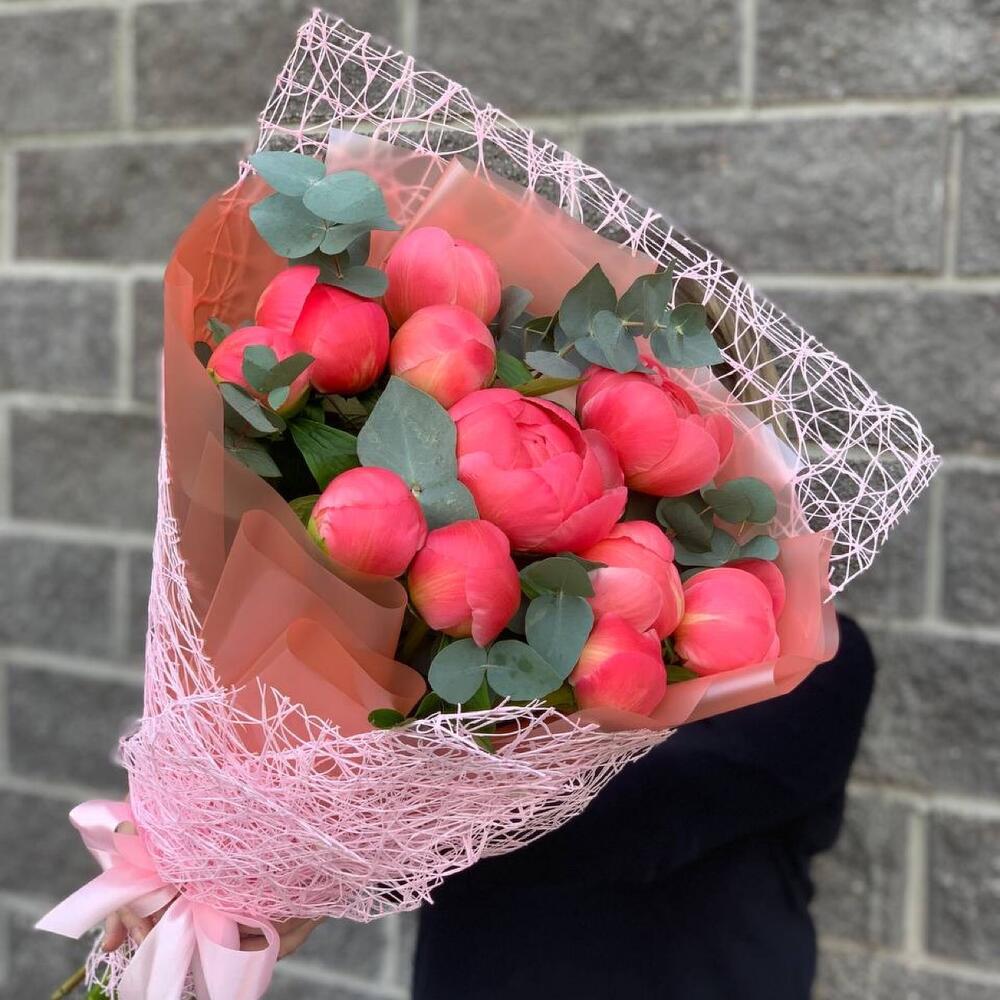 Букет из моно пионовидной кустовой розы Джульетта и эвкалипт