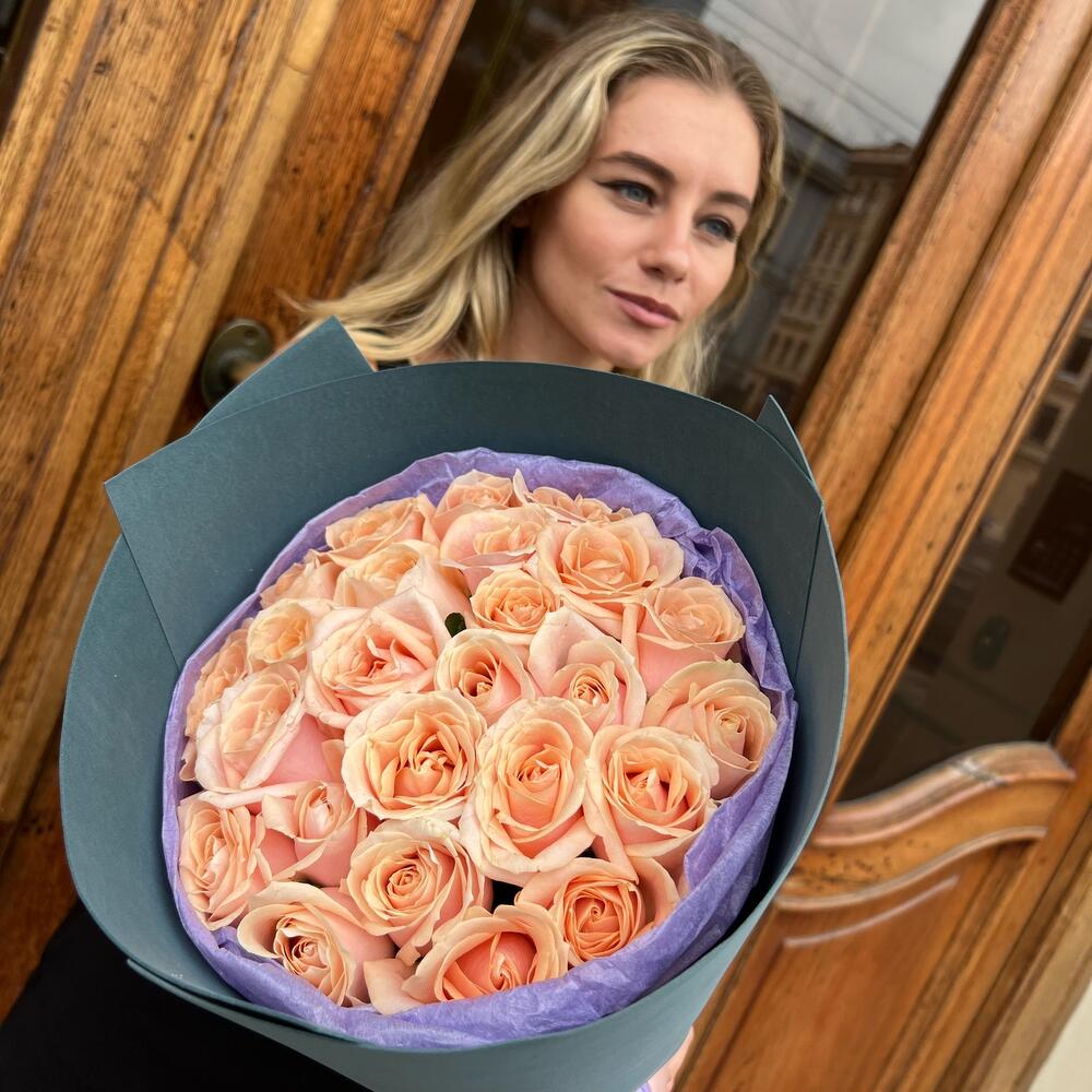 роза премиум 60 см – 25 шт.Дизайнерская упаковка – 2 шт.Лента атласная – 1 шт.Тишью – 1 шт.