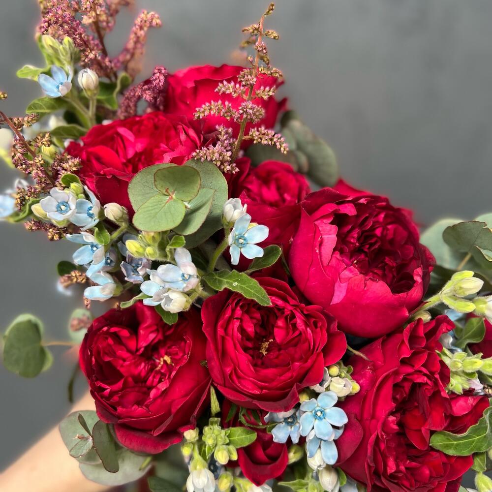 Авторский букет из пионовидных роз, оксипеталум и астильба «Очарование»